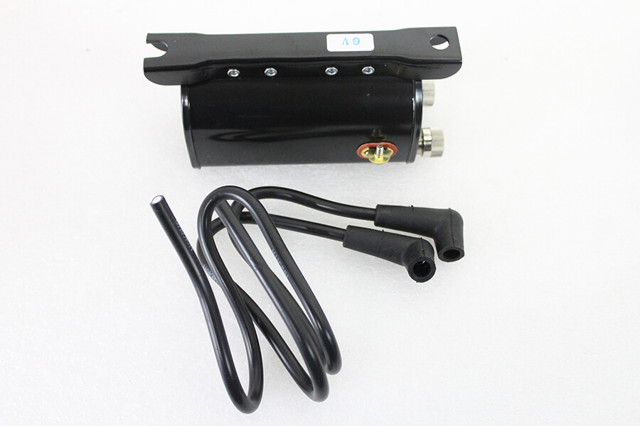 6 volt ignition coil features updated internal wiring and sealing, with nuts, packing and wires.