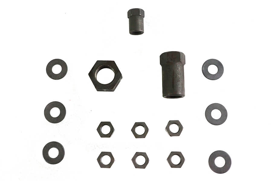 Accurately reproduced special shoulder nuts, nuts and washers fit all 45โs 1932-1973.