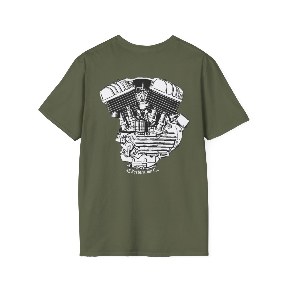 Our 45 Restoration Co. motor on the back of a unisex T-shirt. Perfect for Flathead fans!